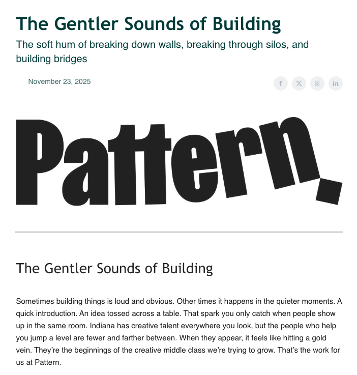 Pattern is a 501(c)(3) nonprofit dedicated to advocating for Indiana’s creative economy. During my brief tenure as Marketing Director, one of my responsibilities was writing on behalf of the organization, everything from social media posts and monthly newsletters to collateral pieces and other external communications.
